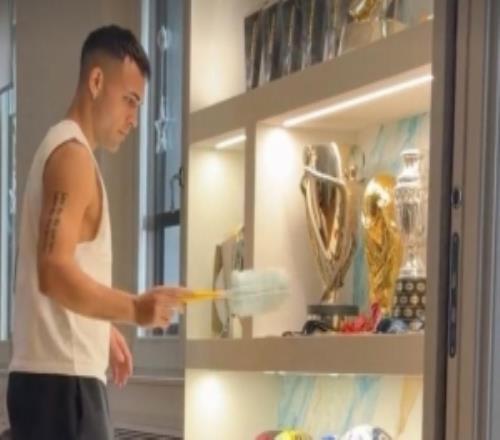 家中享受休闲时光,劳塔罗细心打扫奖杯和MVP小雕像